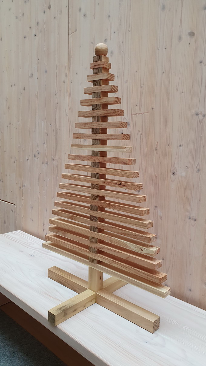 The conceptual design of the tree was contributed by TRAJNA, association for the development of sustainable design, and produced at the Department of Wood Science at the Biotechnical Faculty of the University of Ljubljana. The base of the tree, the spacers between the branches, and the sphere at the top are made of the wood of black locust, while the branches are made of the wood of honey locust. The pendants are made of different types of invasive alien tree species.