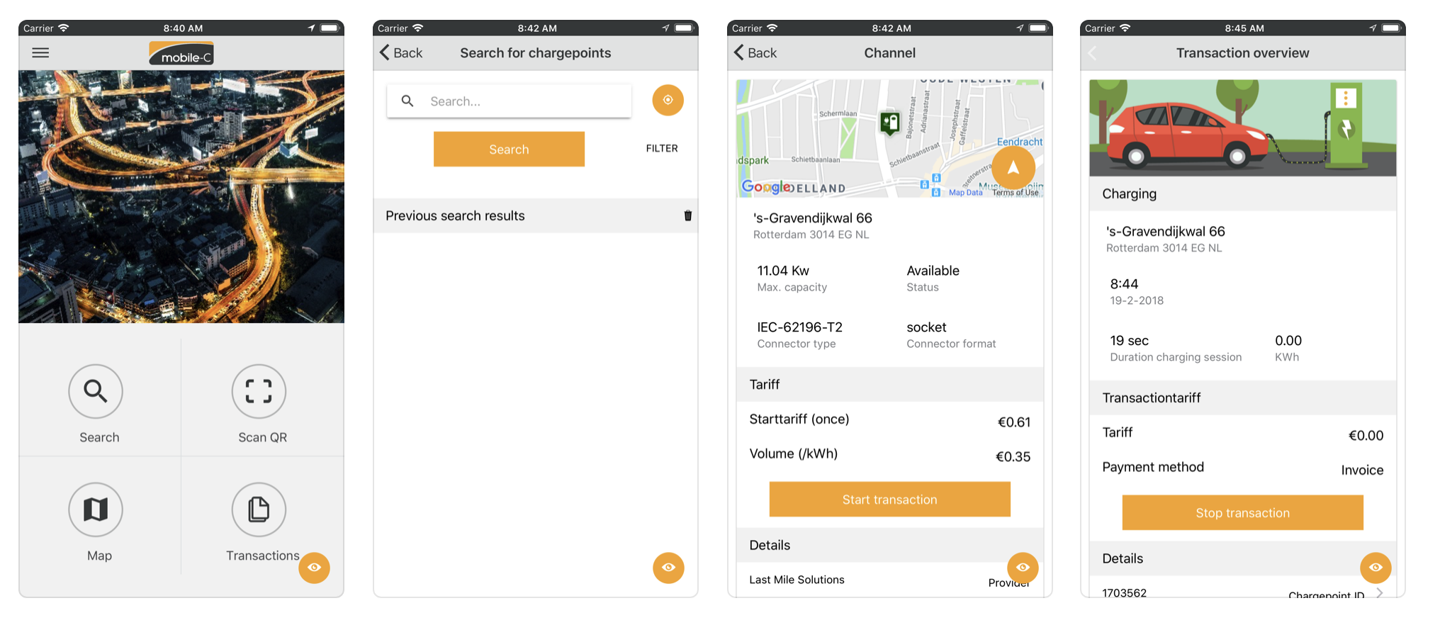 Screenshots of the Mobile-C app by Last Mile Solutions. This app allows users to search for charging stations in their area.