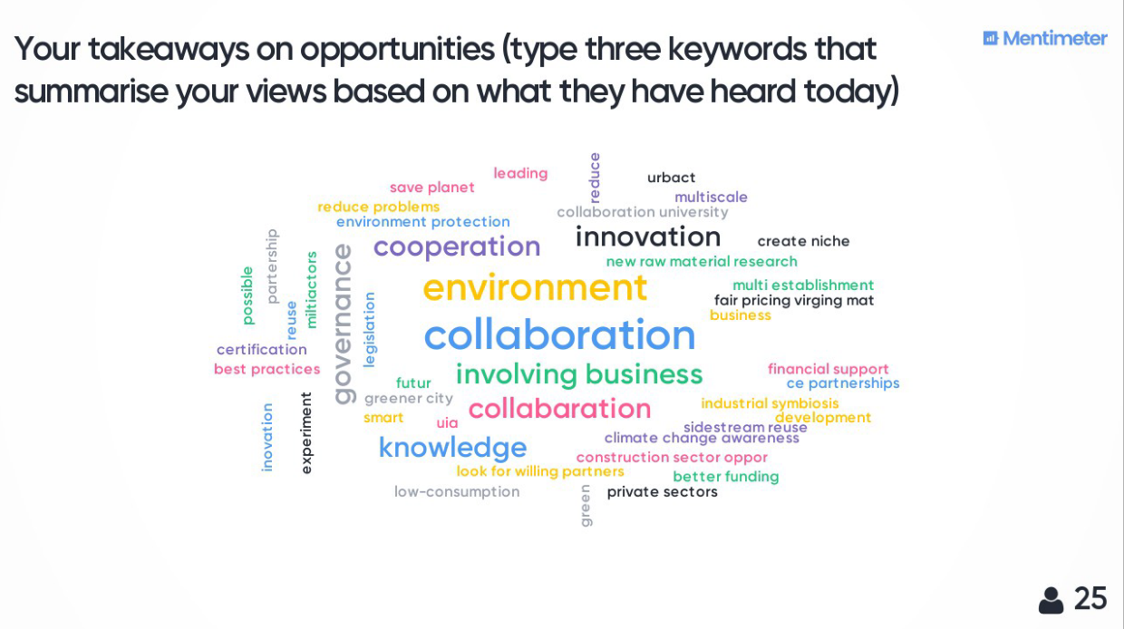 Based on the discussion with the representatives of the four UIA projects and the Urban Agenda Partnership, the audience was asked to provide their takeaways of the challenges and opportunities for circular economy in the future. This has been done through interactive “Mentimeter” Q&A session.