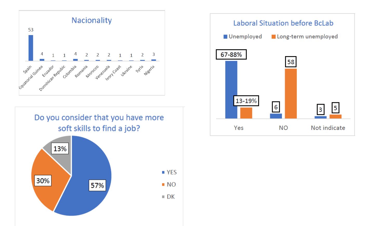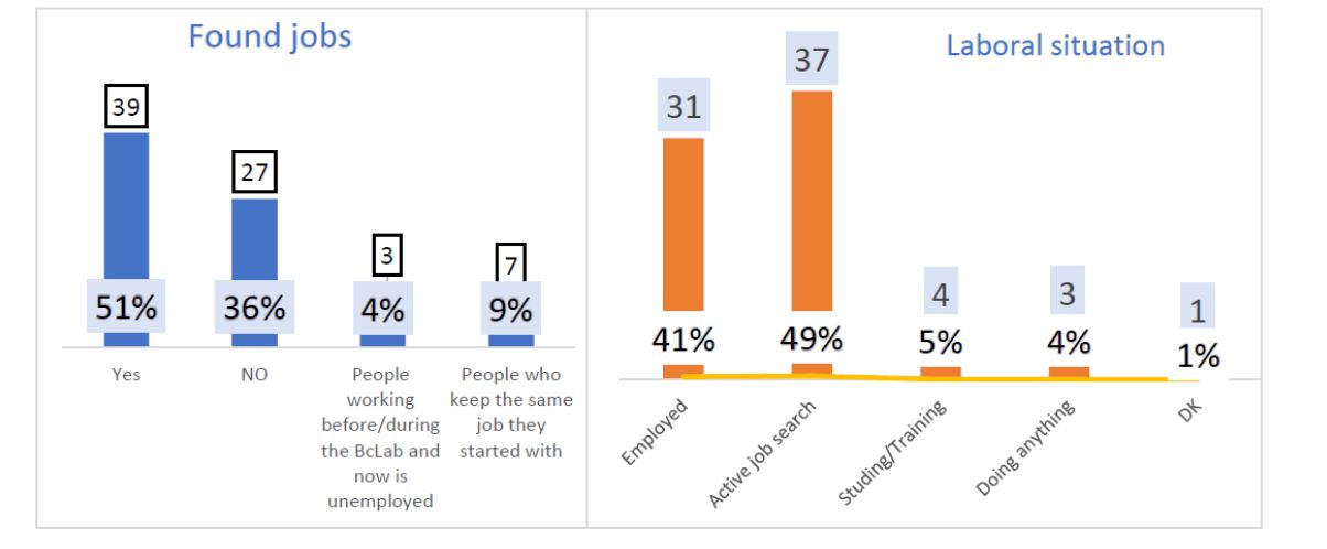 - Corresponding to the perception of improved job search skills, 66% of the people interviewed believe that the BcLab has had an impact on their employability (probability of being hired) either due to issues related to technical skills, the possibility of increasing the CV or by the transversal competences trained throughout the ETEI.