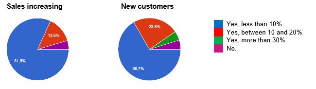 On the other hand, there is also an area dimension: there is now a flow of 206,330 REC across the area and spending in local shops and businesses has increased by 74% (or 25,000 REC) in just the four first months of circulation. Each of the 170 shops and business that accept this currency receive 1,606 REC a month on average and, as a whole, they have earned around 200,000 in these first period. REC recirculation (that is, REC spending by local businesses) is estimated at about 2,375 a month and it is increasingly being used between local businesses and their suppliers. A survey recently conducted by NOVACT among some of these traders has shown that 95.3% of them have increased their customer numbers thanks to the REC introduction, which means that their sales have also increased, as the following graph shows: