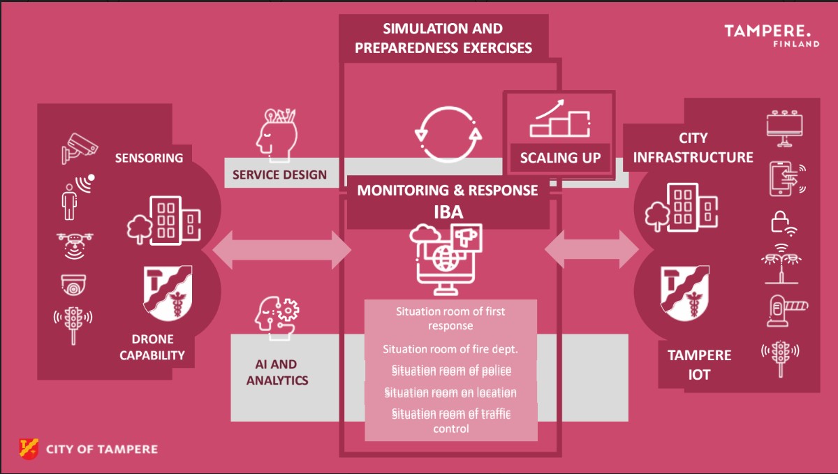 - A governance and change-management dimension that in the past 12 months led to the concrete collaboration between security agencies such as the police and the fire-department, several city departments including the city’s Mayor Office, the Urban Development department, the Risk Management Unit and the new Smart City Unit as well as private actors and investors such as the Nokia Arena and event organisers such as the organisers of the International Hockey Championships 2022.