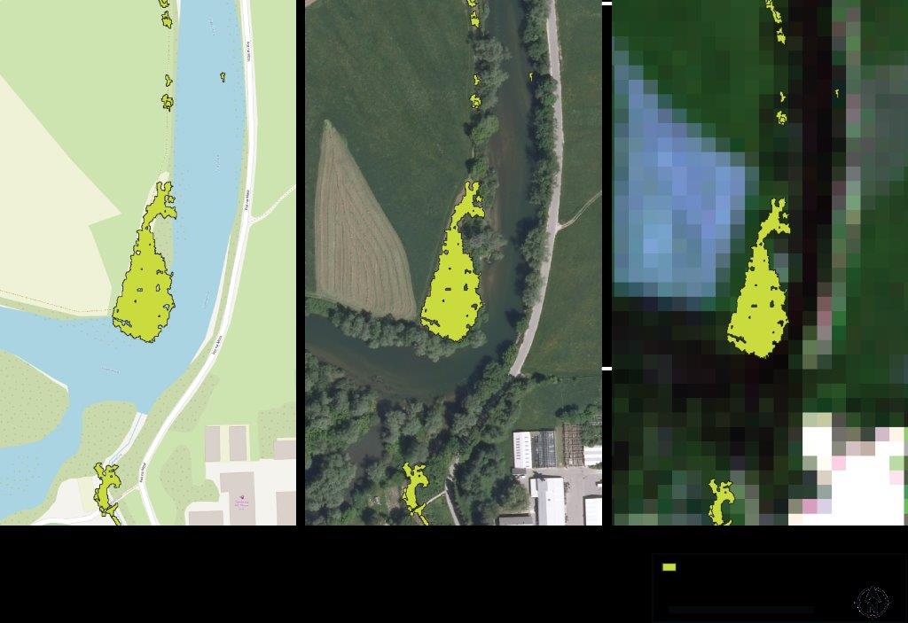 In addition to the time variable, the size of the unit that we detect is also important. A single image element - or a pixel – may not necessarily carry enough important information to determine where exactly invasive alien plant species are located. For a relevant analysis we therefore have to observe a sufficiently large area of Japanese knotweed stands. Most types of invasive alien species are present individually or on smaller land plots and are therefore not always visible at larger spatial scales on satellite images. Conversely, Japanese knotweed creates monoculture stands, which makes it easier to detect compared to other alien species. An alternative data source to satellite images are aerial photographs which have a much higher spatial resolution, but a much lower temporal resolution, as they are acquired approximately once every three years.