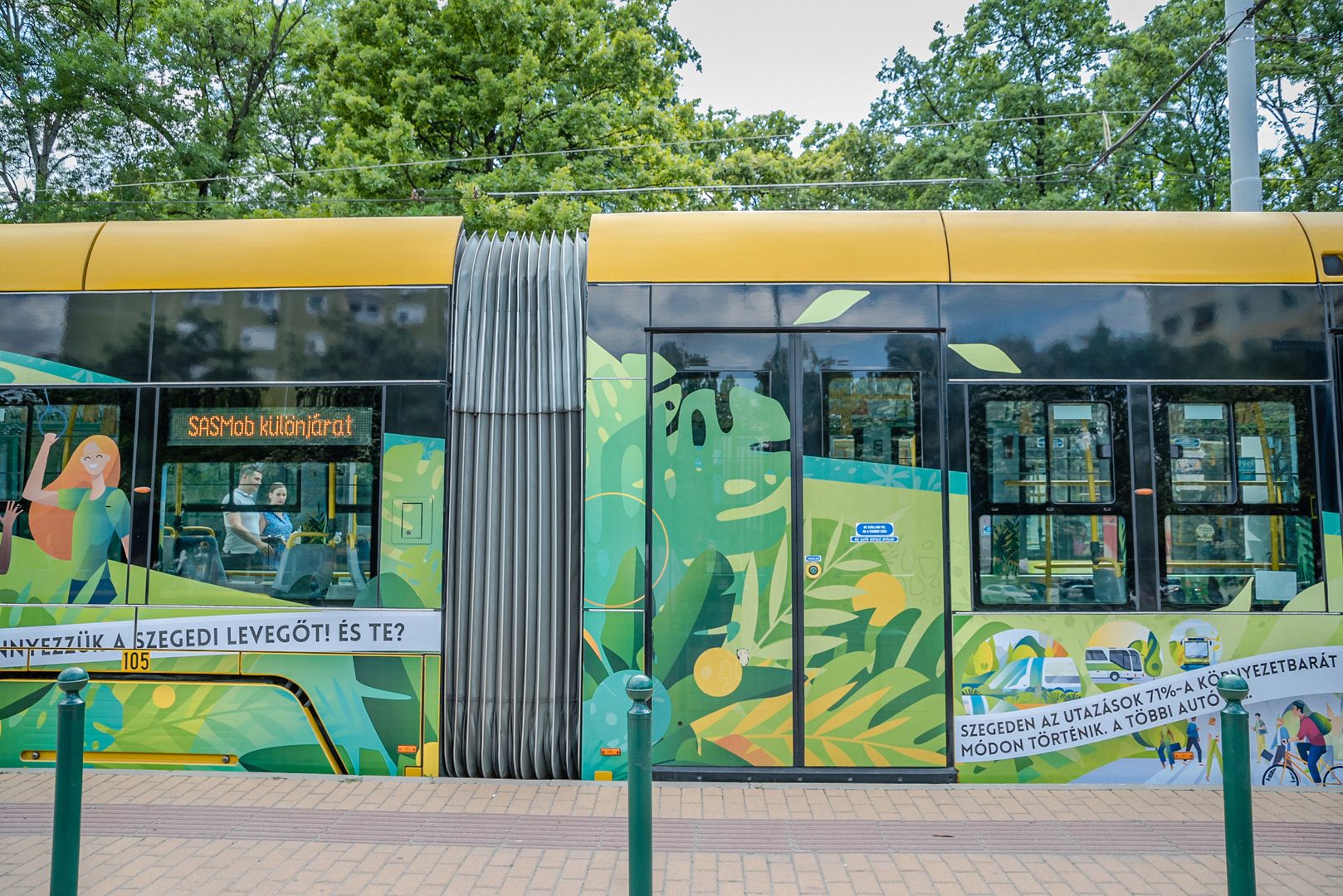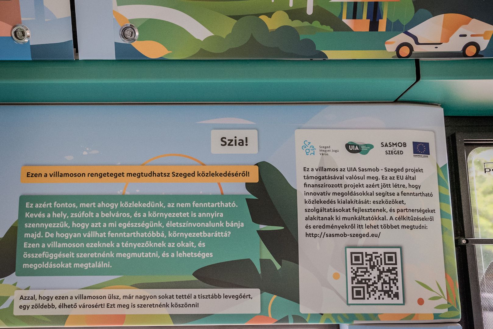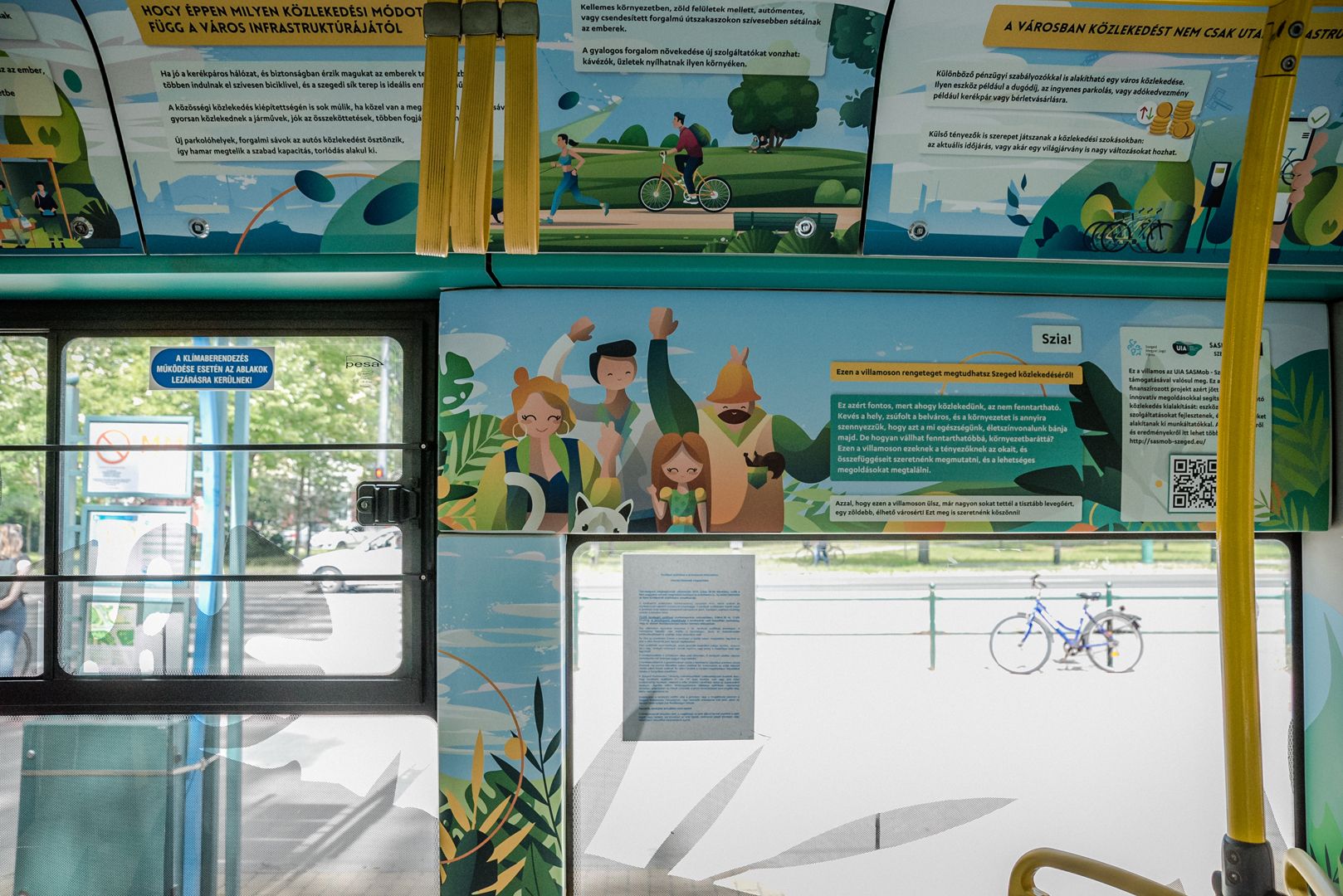 – We would like to thank the inhabitants of Szeged for their contribution to making the city’s air even cleaner, having less dust and noise and fewer traffic jams. Those who do not use cars to travel do make such contributions – said Sándor Nagy. The 105 Pesa, which worked as a “light tram” during the Advent season now works as a “private contractor” for SASMob: in the passenger area, information bubbles are seen in every corner which teach the reader what and how they can do to travel in an even more sustainable and green manner – with bad examples also mentioned. QR codes are found at several spots in the passenger area, which take the reader to the website of environmentally friendly Szeged.