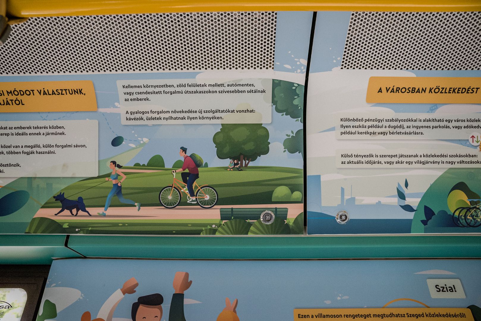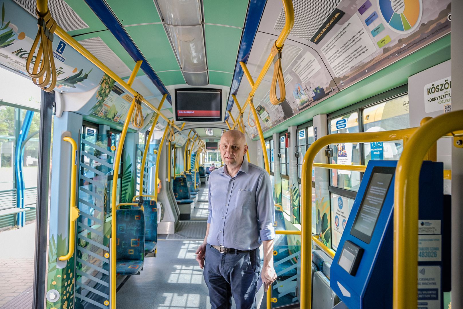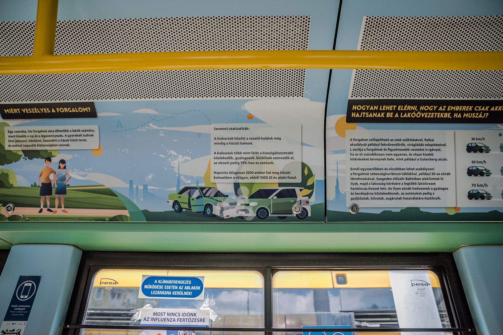 – We would like to thank the inhabitants of Szeged for their contribution to making the city’s air even cleaner, having less dust and noise and fewer traffic jams. Those who do not use cars to travel do make such contributions – said Sándor Nagy. The 105 Pesa, which worked as a “light tram” during the Advent season now works as a “private contractor” for SASMob: in the passenger area, information bubbles are seen in every corner which teach the reader what and how they can do to travel in an even more sustainable and green manner – with bad examples also mentioned. QR codes are found at several spots in the passenger area, which take the reader to the website of environmentally friendly Szeged.